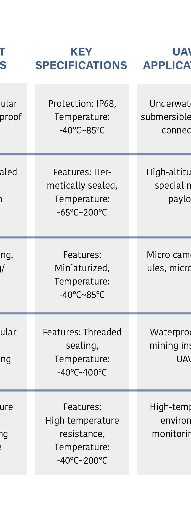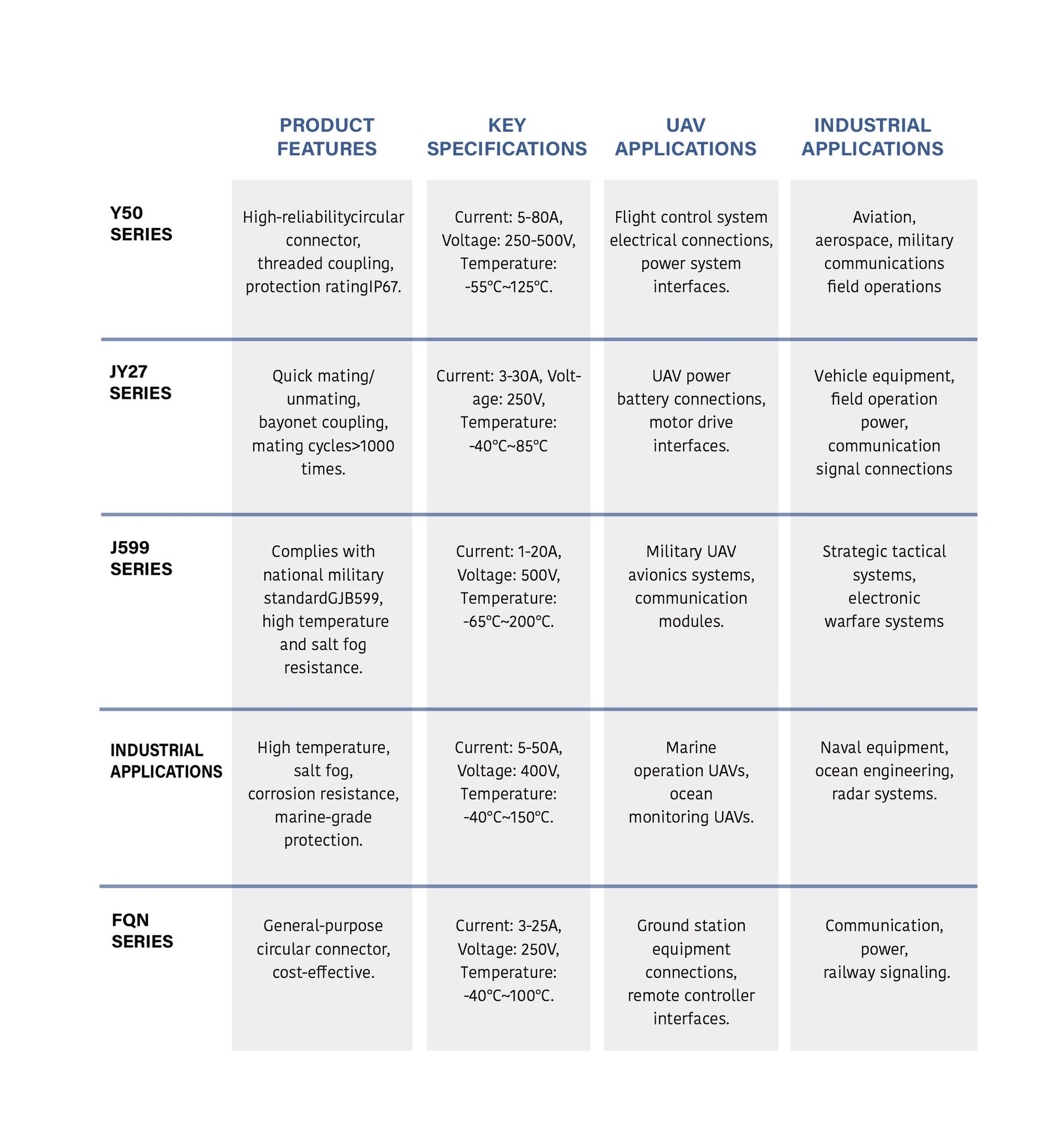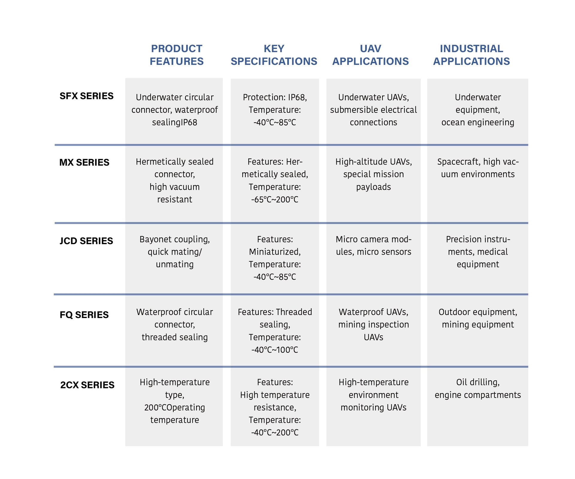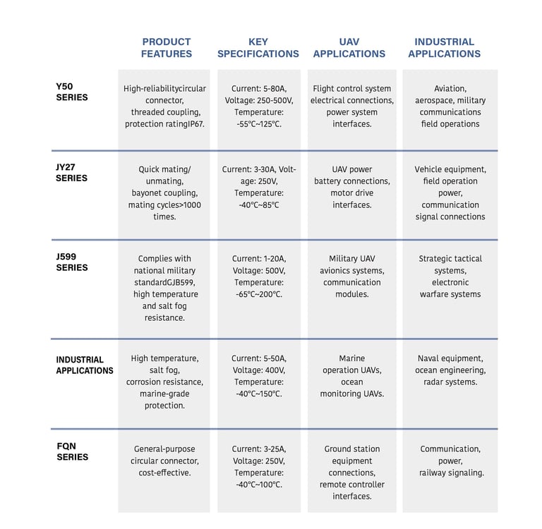 Circular connectors are our core self-developed product series, featuring high reliability, quick mating/unmating, and environmental resistance, suitable for various demanding application scenarios.