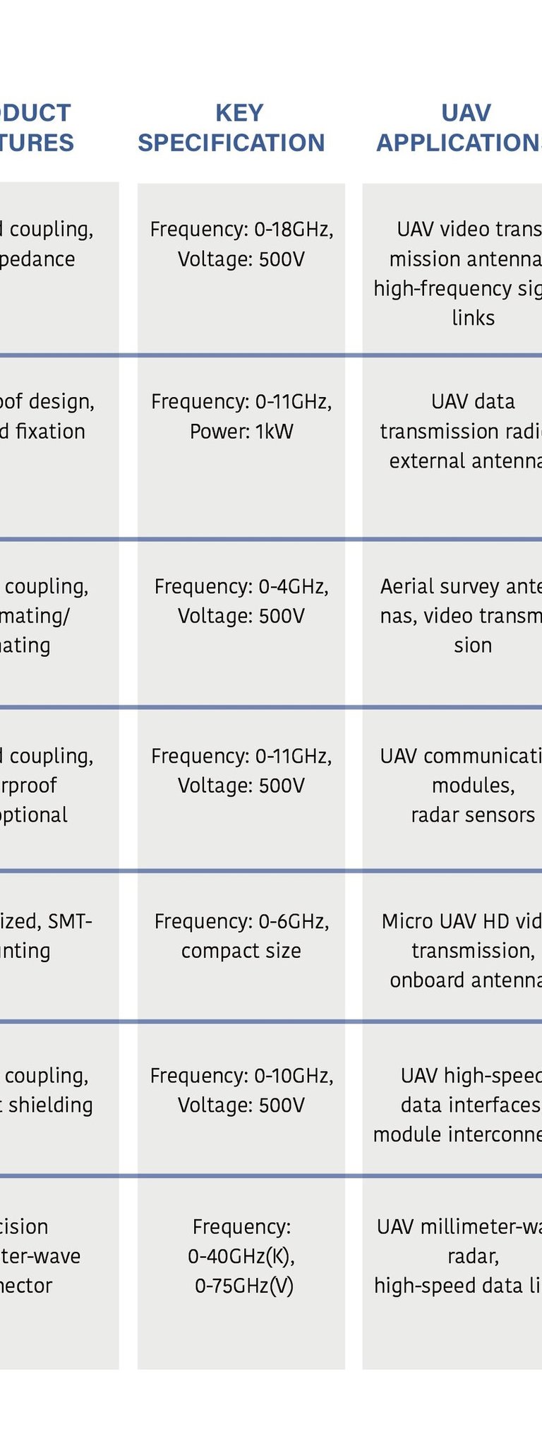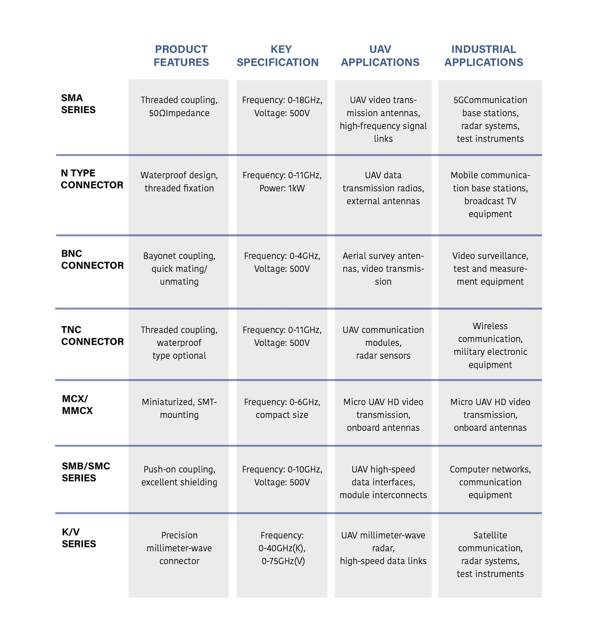 RF coaxial connectors are widely used in military, aerospace, communication, instrumentation and other fields. We provide full series of RF connector products, supporting high-frequency signal transmission with excellent shielding performance and low attenuation characteristics.