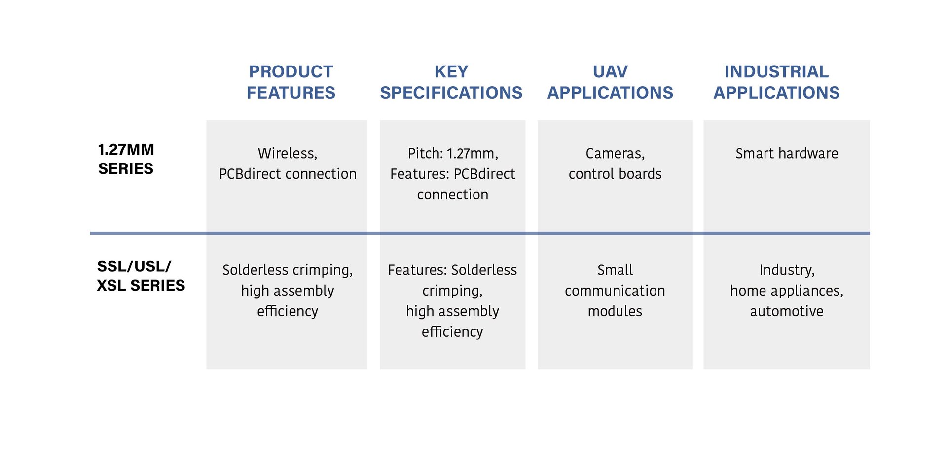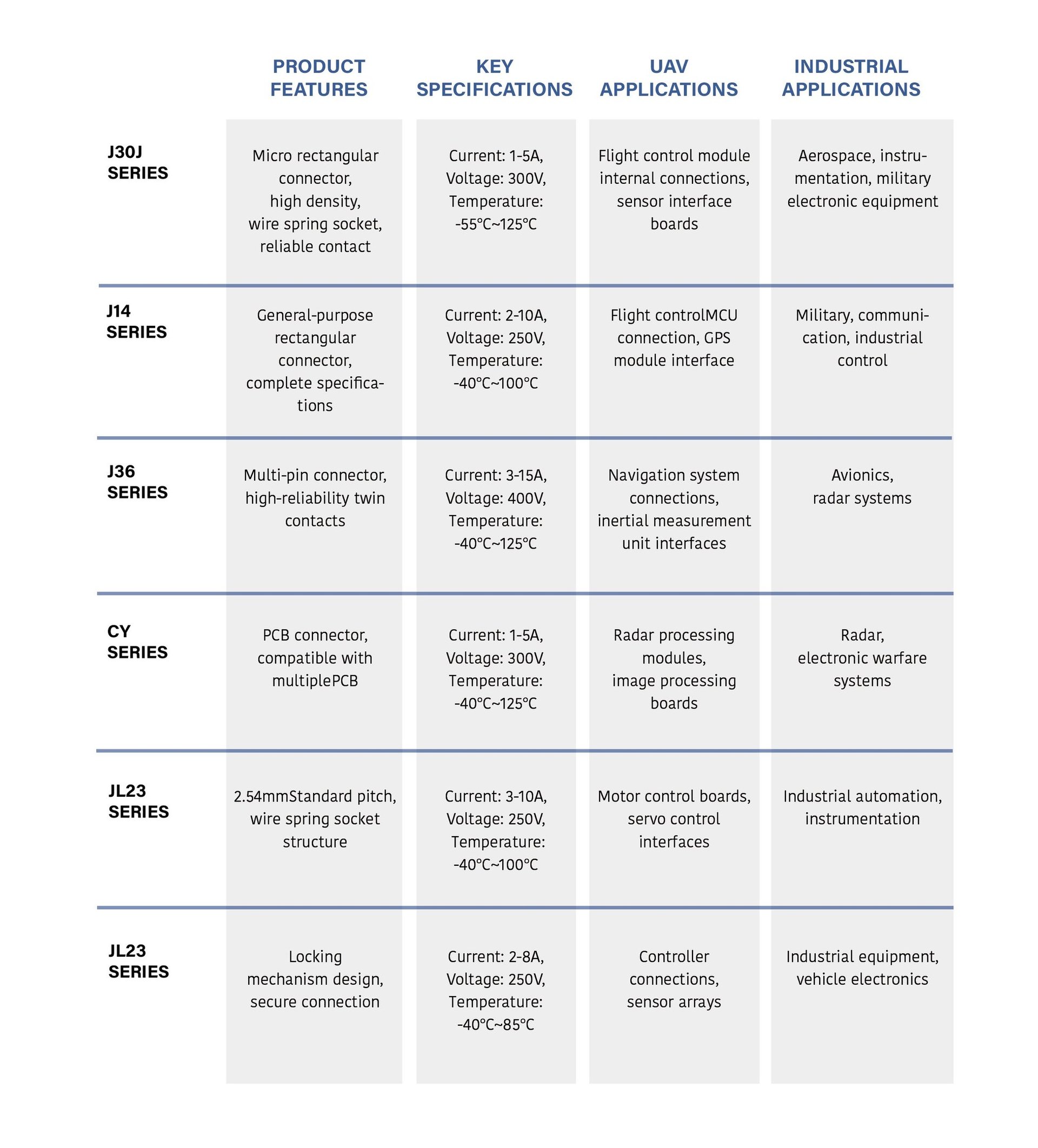 Rectangular connectors are suitable for board-to-board and board-to-wire connections, widely used in aerospace electronics, instrumentation equipment, industrial automation and other fields.